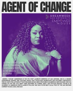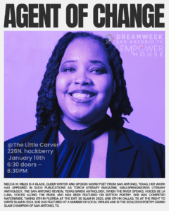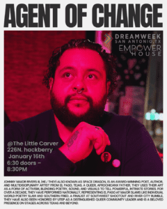 Join us for Agents of Change, a FREE DreamWeek poetry experience featuring some of San Antonio’s most powerful and respected voices in spoken word.