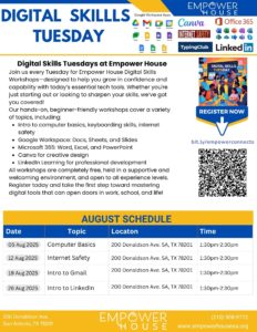 Join us every Tuesday for Empower House Digital Skills Workshops—designed to help you grow in confidence and capability with today’s essential tech tools. Whether you’re just starting out or looking to sharpen your skills, we’ve got you covered! Our hands-on, beginner-friendly workshops cover a variety of topics, including Intro to computer basics, keyboarding skills, internet safety, Google Workspace: Docs, Sheets, and Slides Microsoft 365: Word, Excel, and PowerPoint, Canva for creative design, LinkedIn Learning for professional development. All workshops are completely free, held in a supportive and welcoming environment, and open to all experience levels. Register today and take the first step toward mastering digital tools that can open doors in work, school, and life!
