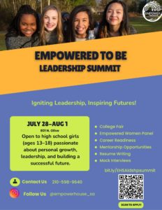 The Empowered to Be Leadership Summit is designed for high school girls (ages 13–18) who are passionate about personal growth, leadership, and shaping a successful future. Participants will engage in a dynamic program featuring a college fair, career readiness workshops, resume writing, mock interviews, mentorship opportunities, and an inspiring Empowered Women panel.