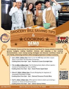 Join Empower House and the San Antonio Food Bank for classes aimed at stretching grocery budgets, making healthier choices, and enjoying a live cooking demonstrations. Learn money-saving strategies and discover nutritious meals for your family, enhancing nutrition while managing expenses in today’s economy.