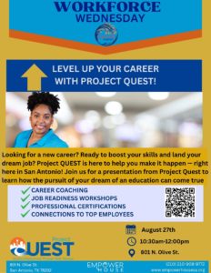 Looking for a new career? Ready to boost your skills and land your dream job? Project QUEST is here to help you make it happen — right here in San Antonio! Join us for a presentation from Project Quest to learn how the pursuit of your dream of an education can come true.