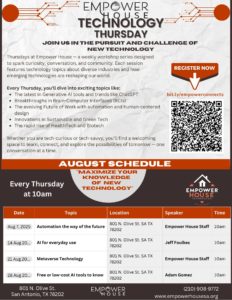 Thursdays at Empower House — a weekly workshop series designed to spark curiosity, conversation, and community. Each session features technology topics about diverse industries and how emerging technologies are reshaping our world. Every Thursday, you’ll dive into exciting topics like: The latest in Generative AI tools and trends like ChatGPT. Breakthroughs in Brain-Computer Interfaces (BCIs). The evolving Future of Work with automation powered design, Innovations in Sustainable and Green Tech. The rapid rise of HealthTech and Biotech Whether you are tech-curious or tech-savvy, you’ll find a welcoming space to learn, connect, and explore the possibilities of tomorrow — one conversation at a time.