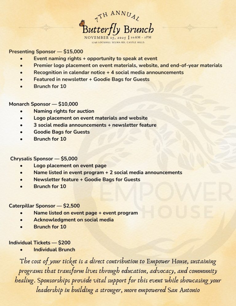 Each fall, as monarchs make their great migration through San Antonio, our community gathers for its own tradition: the Annual Butterfly Brunch. This isn’t just a brunch; it is Empower House’s largest fundraiser of the year, fueling the programs that educate, heal, and empower families across our city.